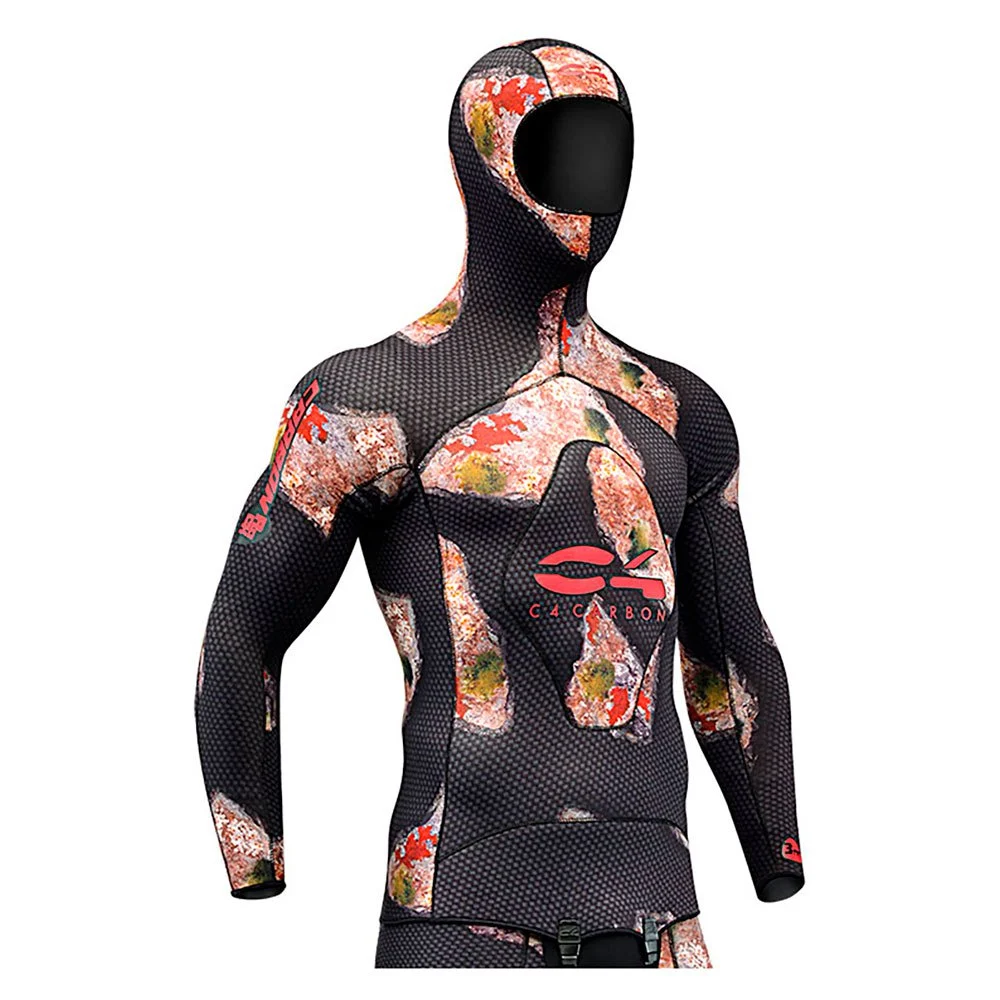 The exclusive design of this wetsuit features a background in carbon fiber color with spots of 3D camouflaged sea bottom.