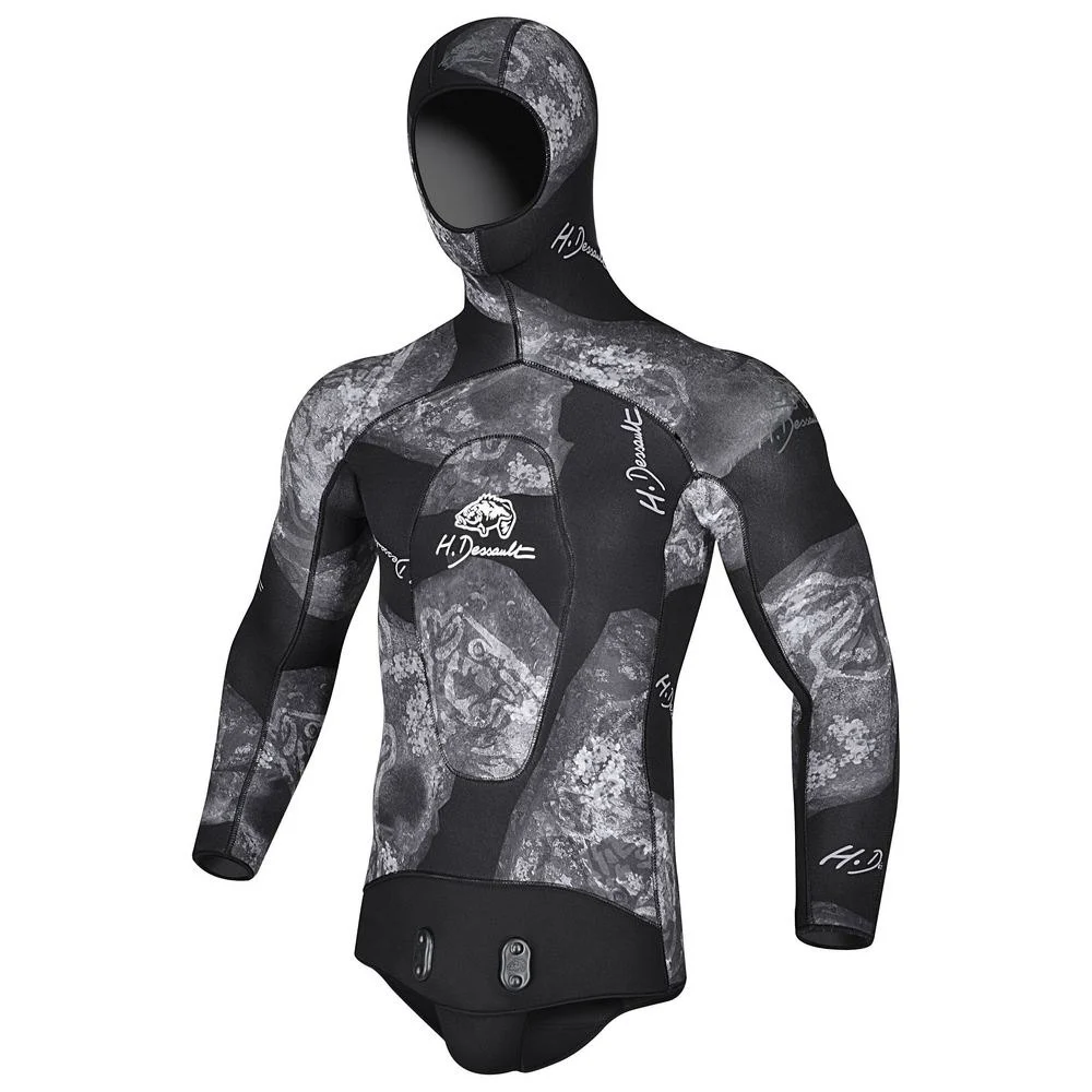 Two piece wetsuit made with single lined neoprene rubber with an elastic camouflaged outer lining.
